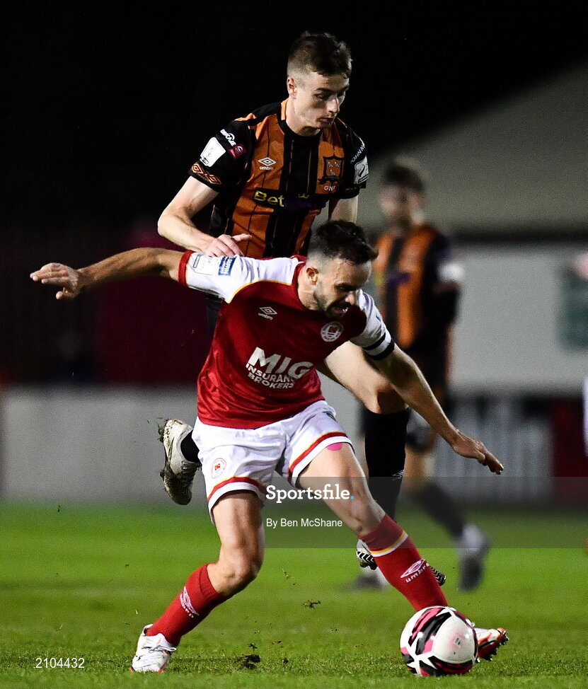 25 October 2021; Robbie Benson of St Patrick's Athletic is tackled by Daniel Kelly of Dundalk during the SSE Airtricity League Premier Division match between St Patrick's Athletic and Dundalk at Richmond Park in Dublin. Photo by Ben McShane/Sportsfile