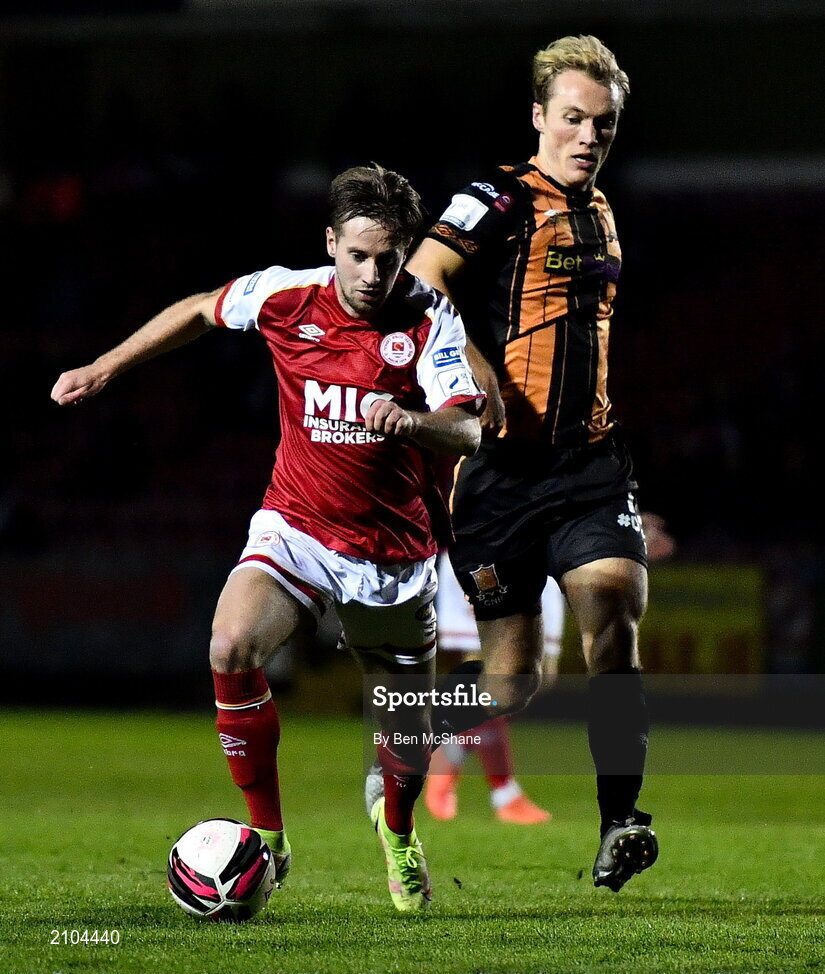 25 October 2021; Billy King of St Patrick's Athletic in action against Greg Sloggett of Dundalk during the SSE Airtricity League Premier Division match between St Patrick's Athletic and Dundalk at Richmond Park in Dublin. Photo by Ben McShane/Sportsfile