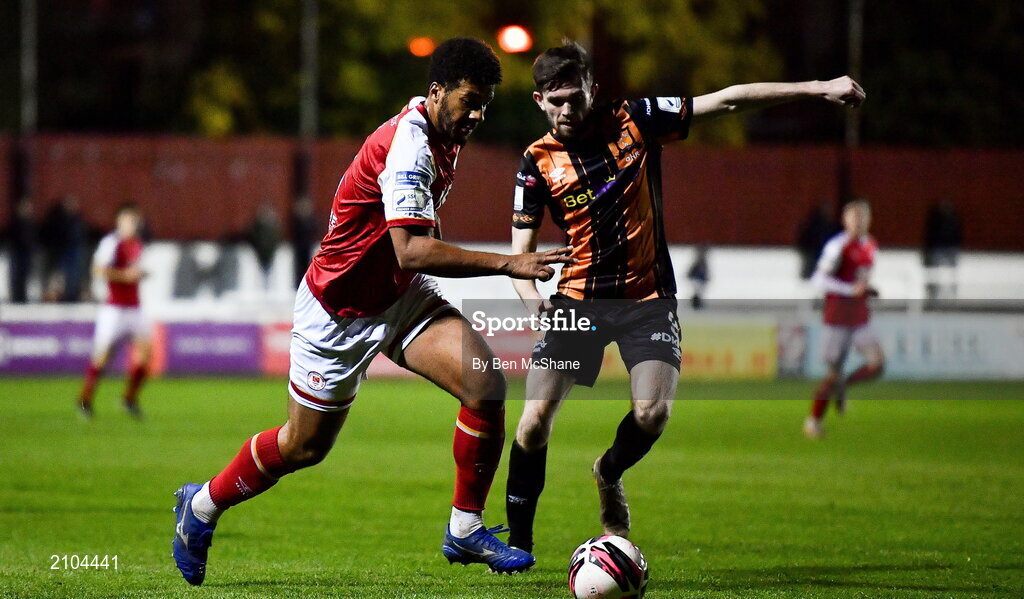 25 October 2021; Kyrian Nwoko of St Patrick's Athletic in action against Sam Stanton of Dundalk during the SSE Airtricity League Premier Division match between St Patrick's Athletic and Dundalk at Richmond Park in Dublin. Photo by Ben McShane/Sportsfile
