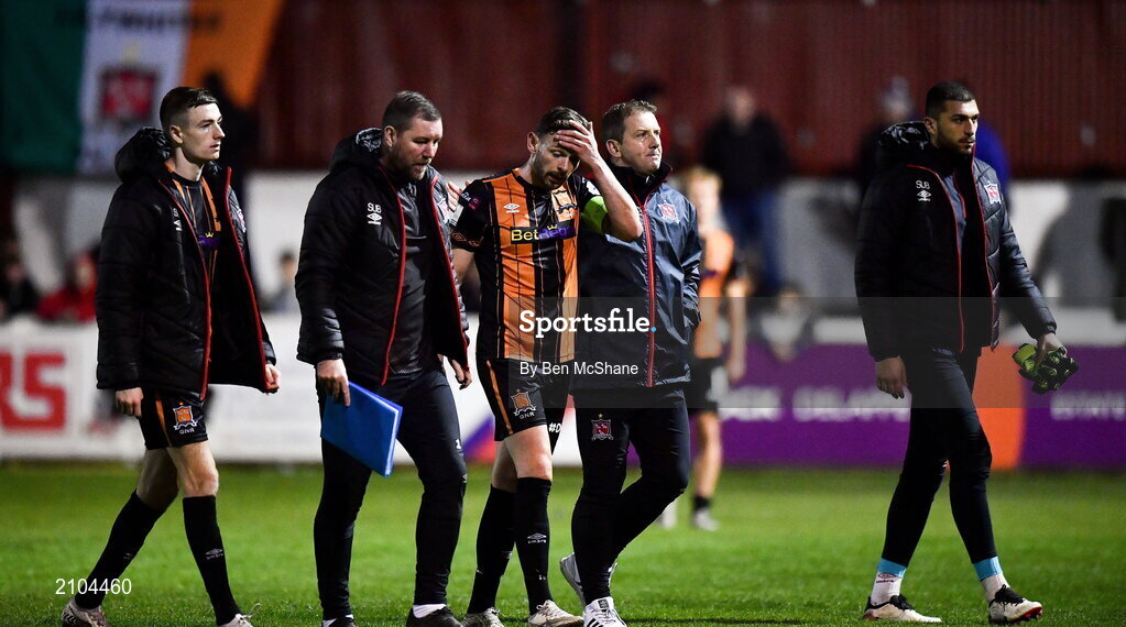25 October 2021; Dundalk head coach Vinny Perth, second from right, and captain Andy Boyle leave the pithc after their side's defeat in the SSE Airtricity League Premier Division match between St Patrick's Athletic and Dundalk at Richmond Park in Dublin. Photo by Ben McShane/Sportsfile