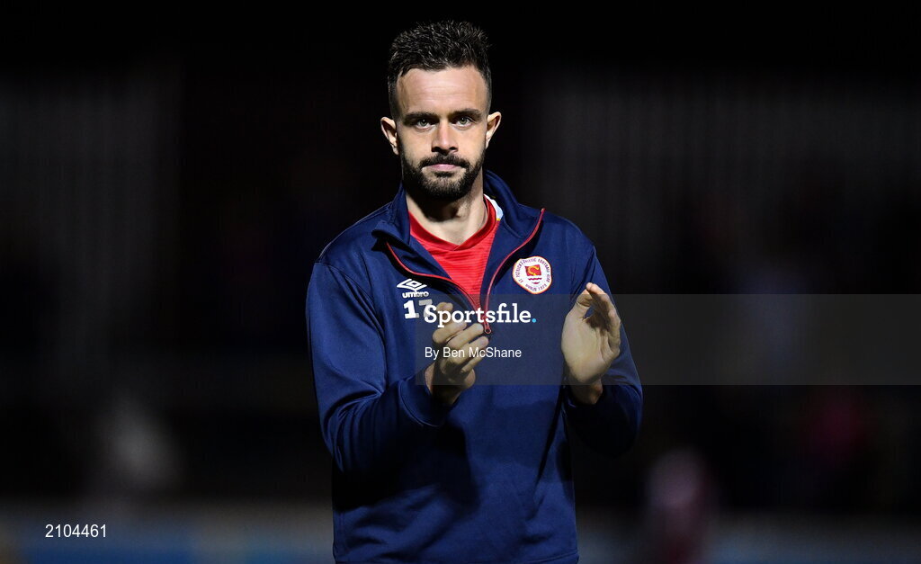 25 October 2021; Robbie Benson of St Patrick's Athletic applauds his side's supporters after the SSE Airtricity League Premier Division match between St Patrick's Athletic and Dundalk at Richmond Park in Dublin. Photo by Ben McShane/Sportsfile