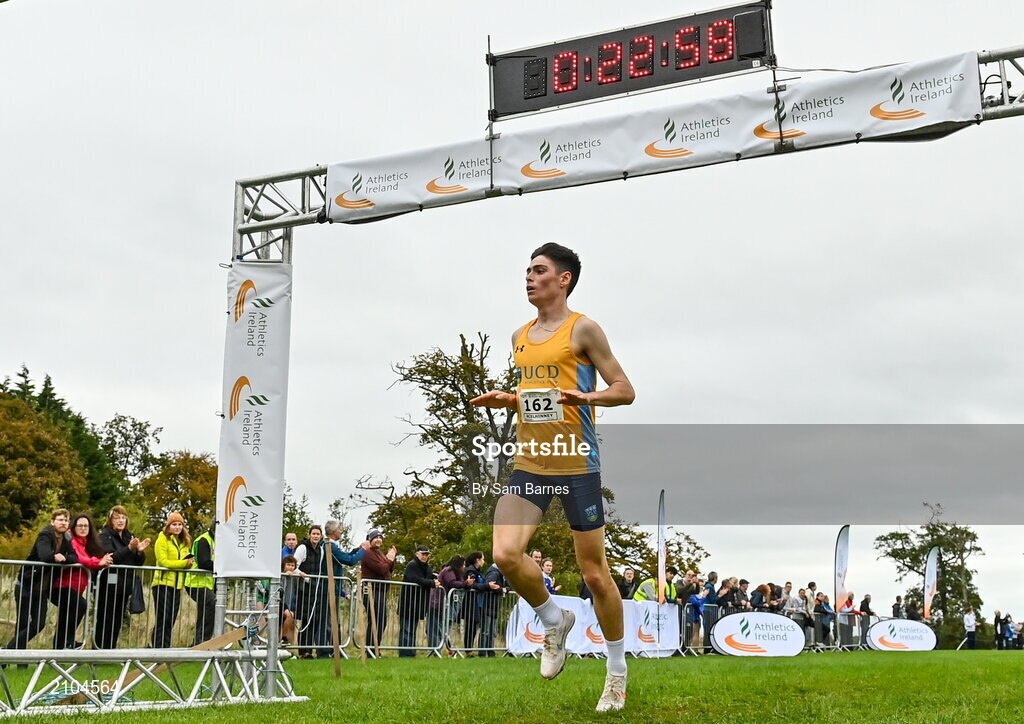 17 October 2021; Darragh McElhinney of UCD AC, Dublin, crosses the line to win the Senior Men's 7500m during the Autumn Open International Cross Country at the Sport Ireland Campus in Dublin. Photo by Sam Barnes/Sportsfile