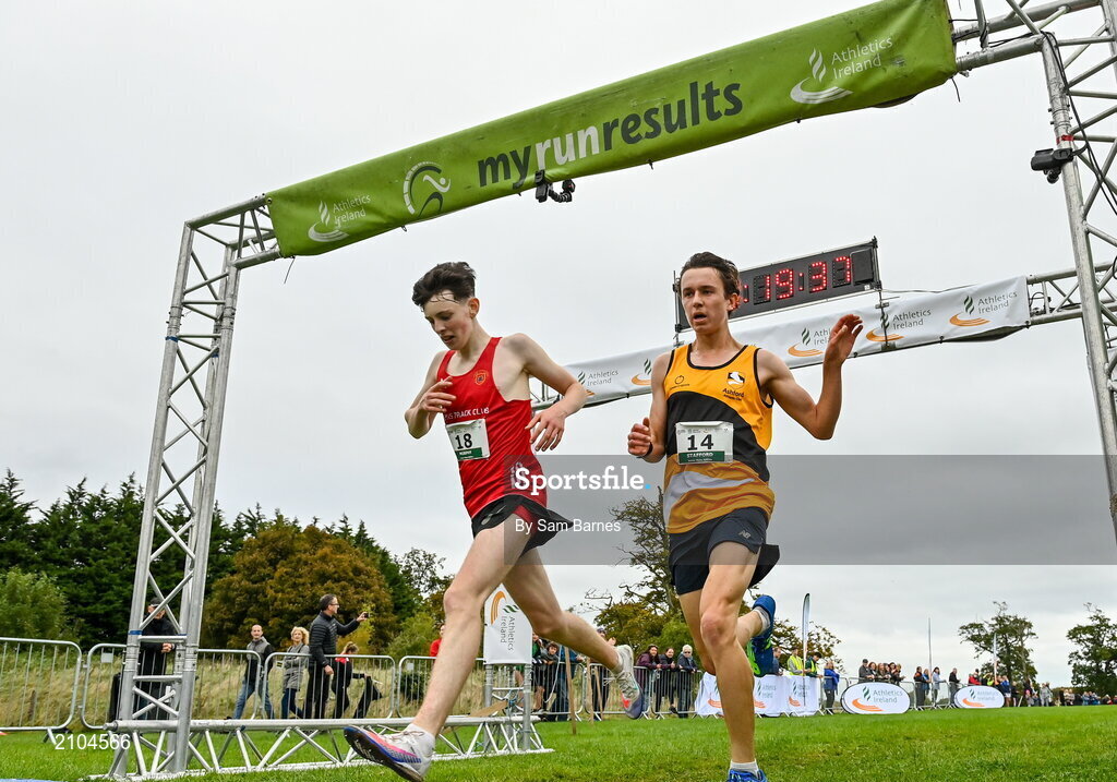 17 October 2021; Niall Murphy of Ennis Track AC, Clare, left, and Jonas Stafford of Ashford AC, Wicklow, cross the finish line after competing in the Junior Men's 6000m during the Autumn Open International Cross Country at the Sport Ireland Campus in Dublin. Photo by Sam Barnes/Sportsfile