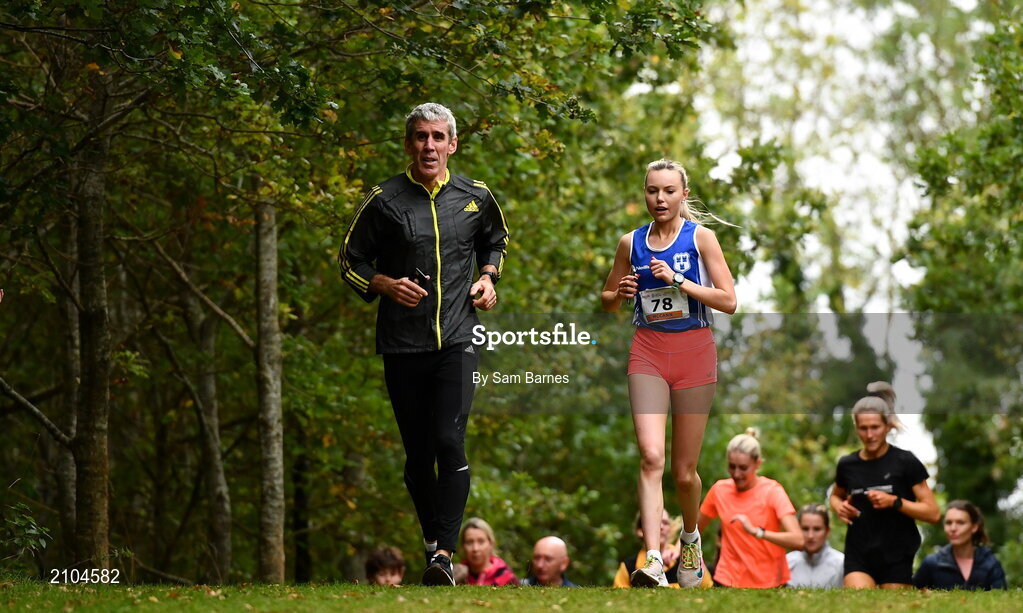 17 October 2021; Jodie McCann of Dublin City Harriers AC, warms down with her coach Enda Fitzpatrick during the Autumn Open International Cross Country at the Sport Ireland Campus in Dublin. Photo by Sam Barnes/Sportsfile