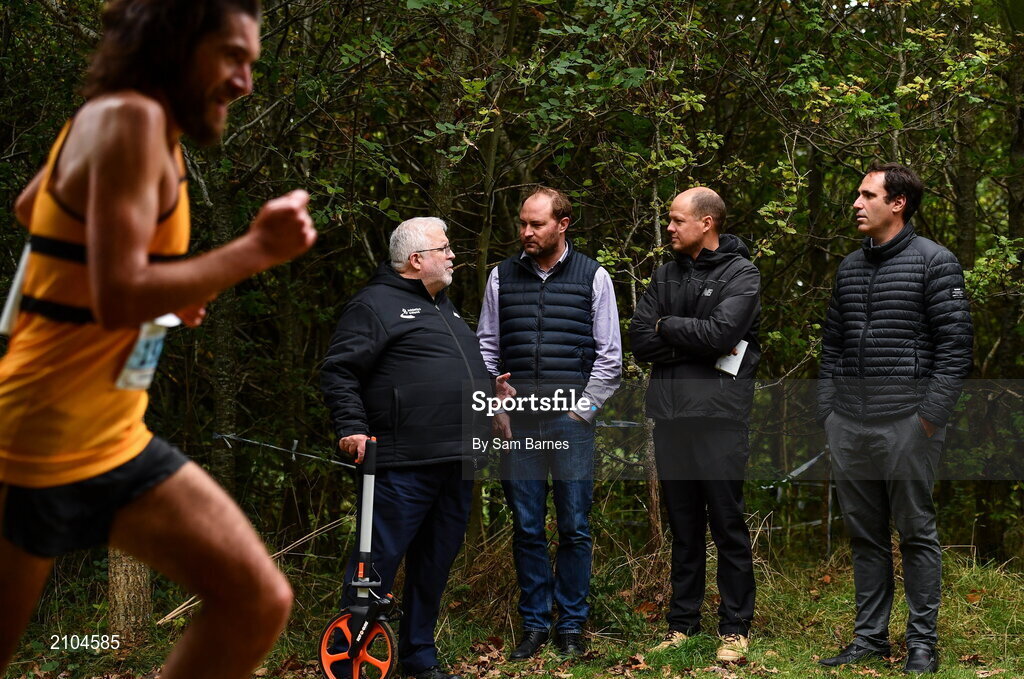 17 October 2021; Athletics Ireland president John Cronin, left, and members of European Athletics inspect the course during the Autumn Open International Cross Country at the Sport Ireland Campus in Dublin. Photo by Sam Barnes/Sportsfile