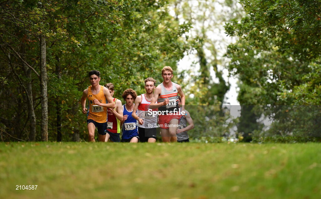 17 October 2021; Runners, from left, Darragh McElhinney of UCD AC, Dublin, Pierre Murchan of Dublin City Harriers AC, Thomas McStay of Galway City Harriers AC, and Tom Mortimer competing in the Senior Men's 7500m during the Autumn Open International Cross Country at the Sport Ireland Campus in Dublin. Photo by Sam Barnes/Sportsfile