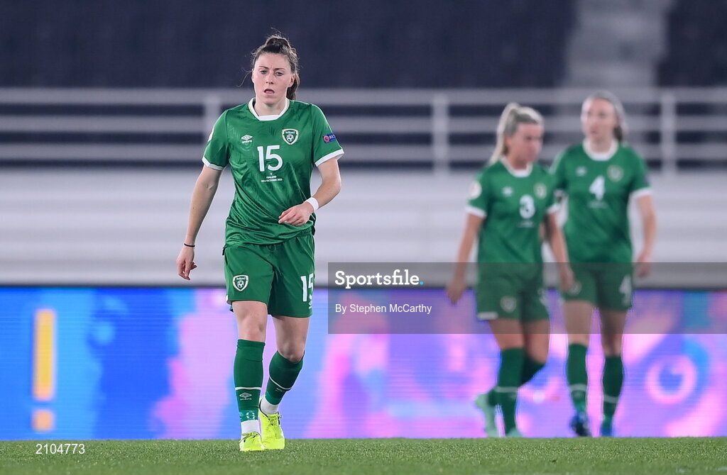 26 October 2021; Lucy Quinn of Republic of Ireland reacts after her side concede their first goal, scored by Adelina Engman of Finland, during the FIFA Women's World Cup 2023 qualifying group A match between Finland and Republic of Ireland at Helsinki Olympic Stadium in Helsinki, Finland. Photo by Stephen McCarthy/Sportsfile