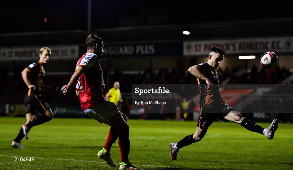 25 October 2021; Billy King of St Patrick's Athletic and Darragh Leahy of Dundalk during the SSE Airtricity League Premier Division match between St Patrick's Athletic and Dundalk at Richmond Park in Dublin. Photo by Ben McShane/Sportsfile