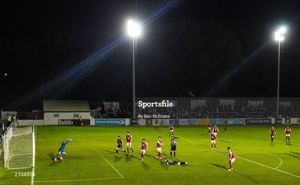 25 October 2021; St Patrick's Athletic goalkeeper Vitezslav Jaros saves a header on goal from Darragh Leahy of Dundalk during the SSE Airtricity League Premier Division match between St Patrick's Athletic and Dundalk at Richmond Park in Dublin. Photo by Ben McShane/Sportsfile