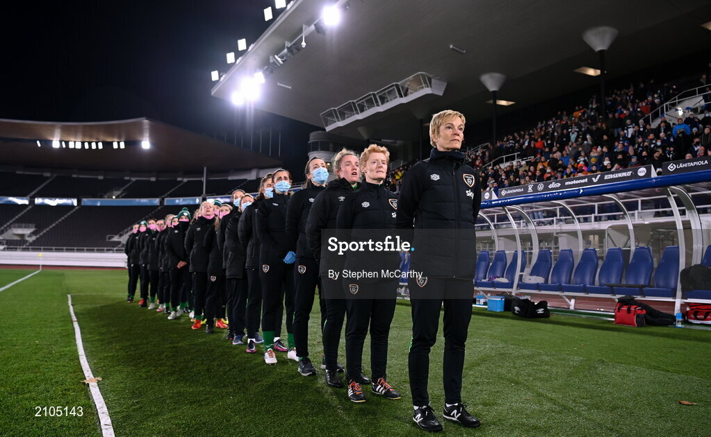 26 October 2021; Republic of Ireland manager Vera Pauw and her backroom staff and players stand for the playing of the National Anthem before the FIFA Women's World Cup 2023 qualifying group A match between Finland and Republic of Ireland at Helsinki Olympic Stadium in Helsinki, Finland. Photo by Stephen McCarthy/Sportsfile