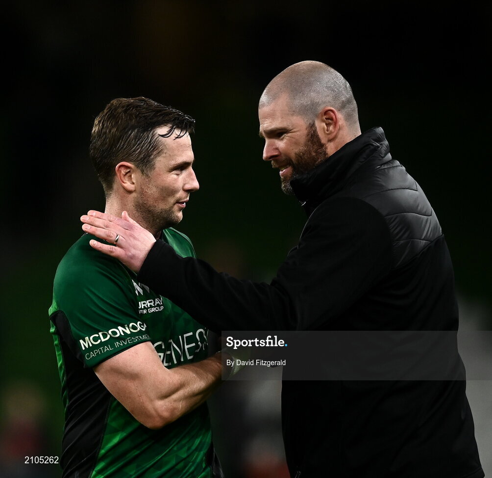 23 October 2021; Connacht senior coach Peter Wilkins with Jack Carty after the United Rugby Championship match between Connacht and Ulster at Aviva Stadium in Dublin. Photo by David Fitzgerald/Sportsfile
