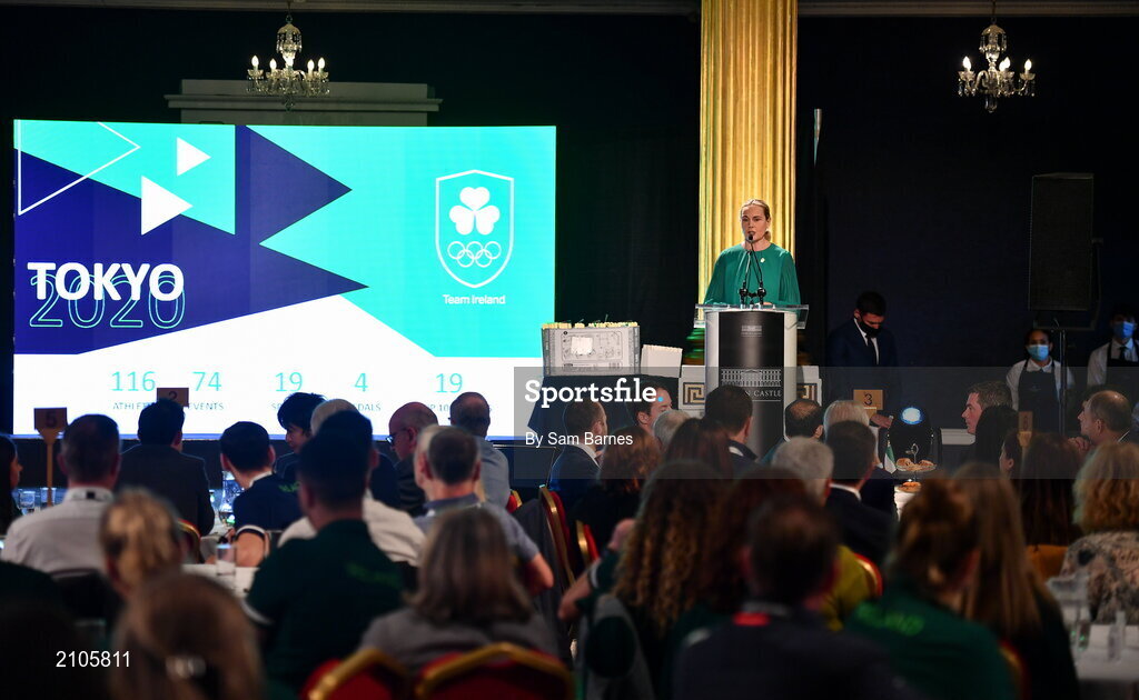 29 October 2021; The athletes and staff who represented Team Ireland at Tokyo 2020 this summer were formally congratulated at the Official Team Ireland Homecoming in Dublin Castle. A record number of Irish athletes competed at the Summer Olympics in Japan with 116 athletes competing across nineteen sports. An Taoiseach Michéal Martin TD, Minister Catherine Martin TD, Minister of State Jack Chambers TD and His Excellency Ambassador Extraordinary and Plenipotentiary of Japan to Ireland, Mr Mitsuru Kitano attended the event to honour the athletes. Speaking at the homecoming is OFI president Sarah Keane. Photo by Sam Barnes/Sportsfile