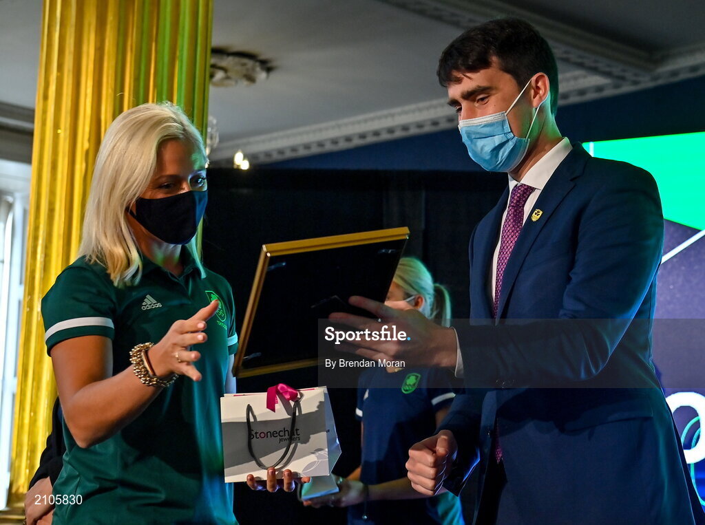 29 October 2021; The athletes and staff who represented Team Ireland at Tokyo 2020 this summer were formally congratulated at the Official Team Ireland Homecoming in Dublin Castle. A record number of Irish athletes competed at the Summer Olympics in Japan with 116 athletes competing across nineteen sports. An Taoiseach Michéal Martin TD, Minister Catherine Martin TD, Minister of State Jack Chambers TD and His Excellency Ambassador Extraordinary and Plenipotentiary of Japan to Ireland, Mr Mitsuru Kitano attended the event to honour the athletes. Making a presentation to Team Ireland athlete Sarah Lavin is Minister of State for Sport, the Gaeltacht & Defence, Jack Chambers TD. Photo by Brendan Moran/Sportsfile