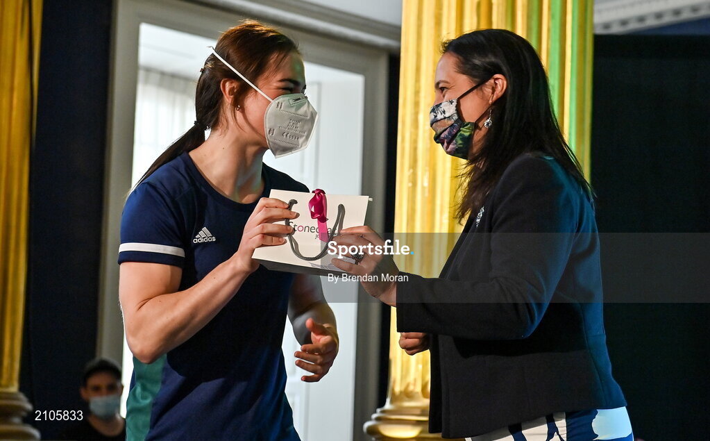 29 October 2021; The athletes and staff who represented Team Ireland at Tokyo 2020 this summer were formally congratulated at the Official Team Ireland Homecoming in Dublin Castle. A record number of Irish athletes competed at the Summer Olympics in Japan with 116 athletes competing across nineteen sports. An Taoiseach Michéal Martin TD, Minister Catherine Martin TD, Minister of State Jack Chambers TD and His Excellency Ambassador Extraordinary and Plenipotentiary of Japan to Ireland, Mr Mitsuru Kitano attended the event to honour the athletes. Making a presentation to Team Ireland athlete Kellie Harrington is Minister for Media, Tourism, Arts, Culture, Sport and the Gaeltacht, Catherine Martin T.D. Photo by Brendan Moran/Sportsfile