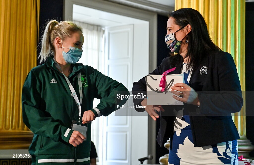 29 October 2021; The athletes and staff who represented Team Ireland at Tokyo 2020 this summer were formally congratulated at the Official Team Ireland Homecoming in Dublin Castle. A record number of Irish athletes competed at the Summer Olympics in Japan with 116 athletes competing across nineteen sports. An Taoiseach Michéal Martin TD, Minister Catherine Martin TD, Minister of State Jack Chambers TD and His Excellency Ambassador Extraordinary and Plenipotentiary of Japan to Ireland, Mr Mitsuru Kitano attended the event to honour the athletes. Making a presentation to Team Ireland athlete Nicci Daly is Minister for Media, Tourism, Arts, Culture, Sport and the Gaeltacht, Catherine Martin T.D. Photo by Brendan Moran/Sportsfile