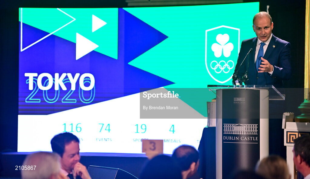 29 October 2021; The athletes and staff who represented Team Ireland at Tokyo 2020 this summer were formally congratulated at the Official Team Ireland Homecoming in Dublin Castle. A record number of Irish athletes competed at the Summer Olympics in Japan with 116 athletes competing across nineteen sports. An Taoiseach Michéal Martin TD, Minister Catherine Martin TD, Minister of State Jack Chambers TD and His Excellency Ambassador Extraordinary and Plenipotentiary of Japan to Ireland, Mr Mitsuru Kitano attended the event to honour the athletes. Speaking at the homecoming is An Taoiseach Micheál Martin TD. Photo by Brendan Moran/Sportsfile