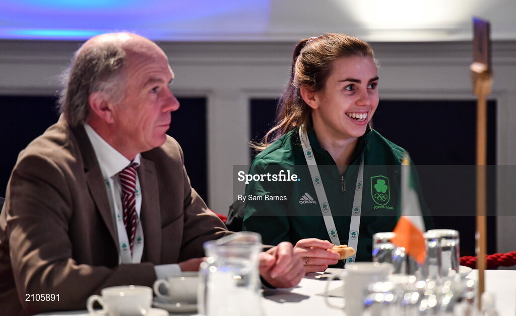 29 October 2021; The athletes and staff who represented Team Ireland at Tokyo 2020 this summer were formally congratulated at the Official Team Ireland Homecoming in Dublin Castle. A record number of Irish athletes competed at the Summer Olympics in Japan with 116 athletes competing across nineteen sports. An Taoiseach Michéal Martin TD, Minister Catherine Martin TD, Minister of State Jack Chambers TD and His Excellency Ambassador Extraordinary and Plenipotentiary of Japan to Ireland, Mr Mitsuru Kitano attended the event to honour the athletes. In attendance is Olympian Louise Shanahan with Ray Shanahan. Photo by Sam Barnes/Sportsfile