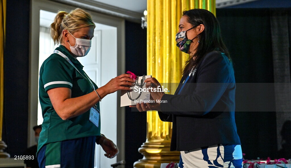 29 October 2021; The athletes and staff who represented Team Ireland at Tokyo 2020 this summer were formally congratulated at the Official Team Ireland Homecoming in Dublin Castle. A record number of Irish athletes competed at the Summer Olympics in Japan with 116 athletes competing across nineteen sports. An Taoiseach Michéal Martin TD, Minister Catherine Martin TD, Minister of State Jack Chambers TD and His Excellency Ambassador Extraordinary and Plenipotentiary of Japan to Ireland, Mr Mitsuru Kitano attended the event to honour the athletes. Making a presentation to Team Ireland athlete Heike Holstein is Minister for Media, Tourism, Arts, Culture, Sport and the Gaeltacht, Catherine Martin T.D. Photo by Brendan Moran/Sportsfile