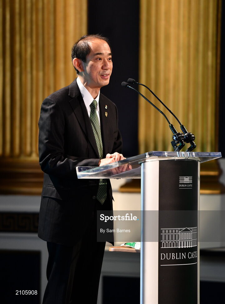 29 October 2021; The athletes and staff who represented Team Ireland at Tokyo 2020 this summer were formally congratulated at the Official Team Ireland Homecoming in Dublin Castle. A record number of Irish athletes competed at the Summer Olympics in Japan with 116 athletes competing across nineteen sports. An Taoiseach Michéal Martin TD, Minister Catherine Martin TD, Minister of State Jack Chambers TD and His Excellency Ambassador Extraordinary and Plenipotentiary of Japan to Ireland, Mr Mitsuru Kitano attended the event to honour the athletes. Speaking at the homecoming is His Excellency Ambassador Extraordinary and Plenipotentiary of Japan to Ireland, Mr Mitsuru Kitano. Photo by Sam Barnes/Sportsfile
