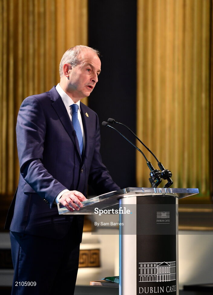 29 October 2021; The athletes and staff who represented Team Ireland at Tokyo 2020 this summer were formally congratulated at the Official Team Ireland Homecoming in Dublin Castle. A record number of Irish athletes competed at the Summer Olympics in Japan with 116 athletes competing across nineteen sports. An Taoiseach Michéal Martin TD, Minister Catherine Martin TD, Minister of State Jack Chambers TD and His Excellency Ambassador Extraordinary and Plenipotentiary of Japan to Ireland, Mr Mitsuru Kitano attended the event to honour the athletes. Speaking at the homecoming is An Taoiseach Micheál Martin TD. Photo by Sam Barnes/Sportsfile