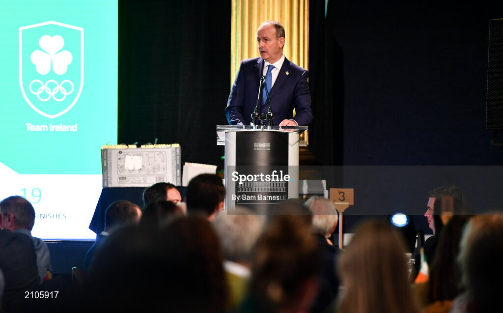 29 October 2021; The athletes and staff who represented Team Ireland at Tokyo 2020 this summer were formally congratulated at the Official Team Ireland Homecoming in Dublin Castle. A record number of Irish athletes competed at the Summer Olympics in Japan with 116 athletes competing across nineteen sports. An Taoiseach Michéal Martin TD, Minister Catherine Martin TD, Minister of State Jack Chambers TD and His Excellency Ambassador Extraordinary and Plenipotentiary of Japan to Ireland, Mr Mitsuru Kitano attended the event to honour the athletes. Speaking at the homecoming is An Taoiseach Micheál Martin TD. Photo by Sam Barnes/Sportsfile