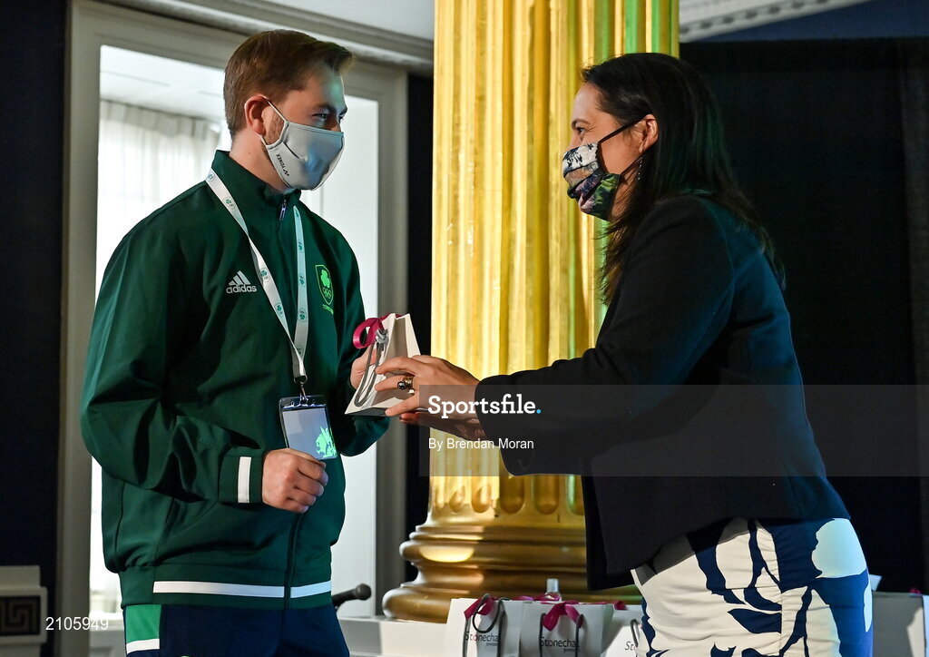29 October 2021; The athletes and staff who represented Team Ireland at Tokyo 2020 this summer were formally congratulated at the Official Team Ireland Homecoming in Dublin Castle. A record number of Irish athletes competed at the Summer Olympics in Japan with 116 athletes competing across nineteen sports. An Taoiseach Michéal Martin TD, Minister Catherine Martin TD, Minister of State Jack Chambers TD and His Excellency Ambassador Extraordinary and Plenipotentiary of Japan to Ireland, Mr Mitsuru Kitano attended the event to honour the athletes. Making a presentation to Team Ireland support staff member Daniel Magee is Minister for Media, Tourism, Arts, Culture, Sport and the Gaeltacht, Catherine Martin T.D. Photo by Brendan Moran/Sportsfile