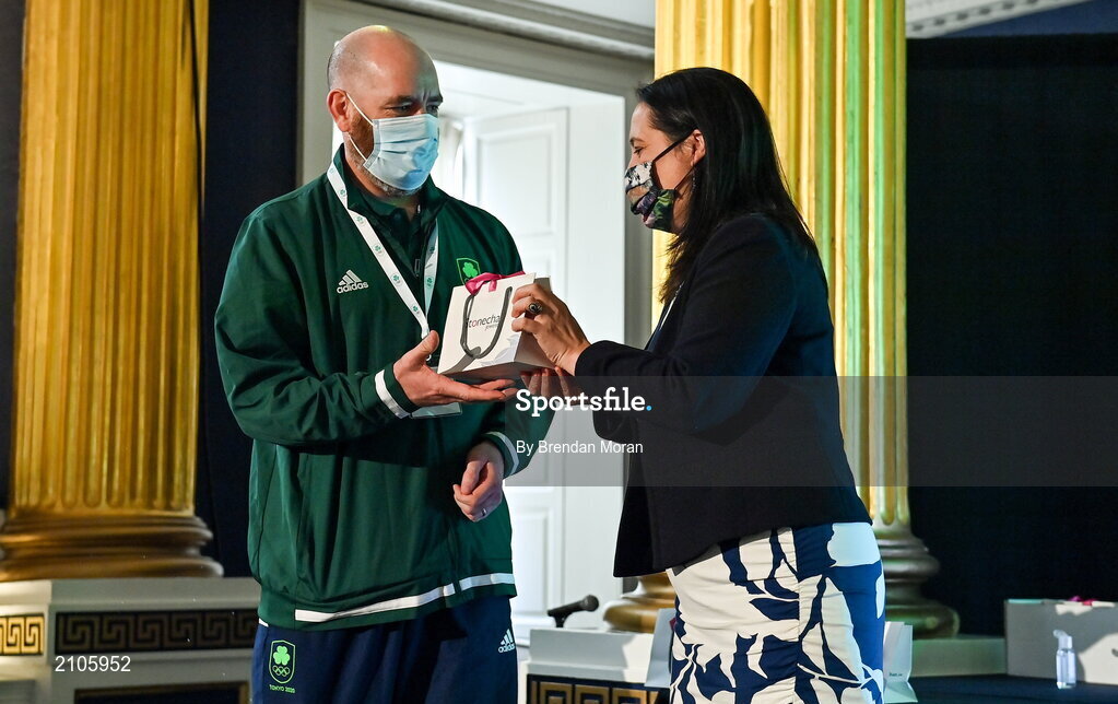 29 October 2021; The athletes and staff who represented Team Ireland at Tokyo 2020 this summer were formally congratulated at the Official Team Ireland Homecoming in Dublin Castle. A record number of Irish athletes competed at the Summer Olympics in Japan with 116 athletes competing across nineteen sports. An Taoiseach Michéal Martin TD, Minister Catherine Martin TD, Minister of State Jack Chambers TD and His Excellency Ambassador Extraordinary and Plenipotentiary of Japan to Ireland, Mr Mitsuru Kitano attended the event to honour the athletes. Making a presentation to Team Ireland support staff member Paul Carragher is Minister for Media, Tourism, Arts, Culture, Sport and the Gaeltacht, Catherine Martin T.D. Photo by Brendan Moran/Sportsfile
