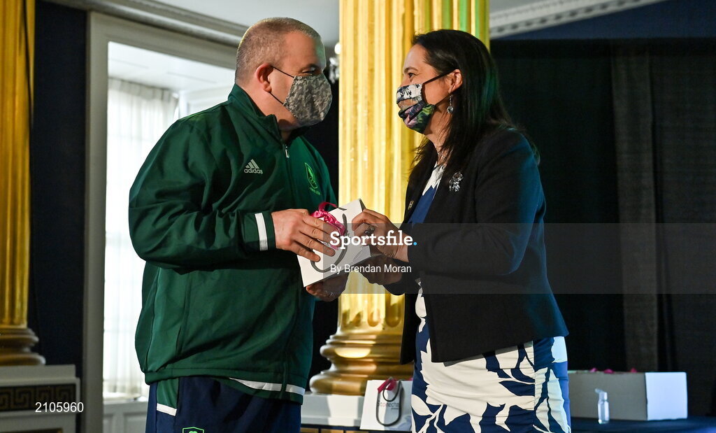 29 October 2021; The athletes and staff who represented Team Ireland at Tokyo 2020 this summer were formally congratulated at the Official Team Ireland Homecoming in Dublin Castle. A record number of Irish athletes competed at the Summer Olympics in Japan with 116 athletes competing across nineteen sports. An Taoiseach Michéal Martin TD, Minister Catherine Martin TD, Minister of State Jack Chambers TD and His Excellency Ambassador Extraordinary and Plenipotentiary of Japan to Ireland, Mr Mitsuru Kitano attended the event to honour the athletes. Making a presentation to Team Ireland support staff member Liam Harbison is Minister for Media, Tourism, Arts, Culture, Sport and the Gaeltacht, Catherine Martin T.D. Photo by Brendan Moran/Sportsfile