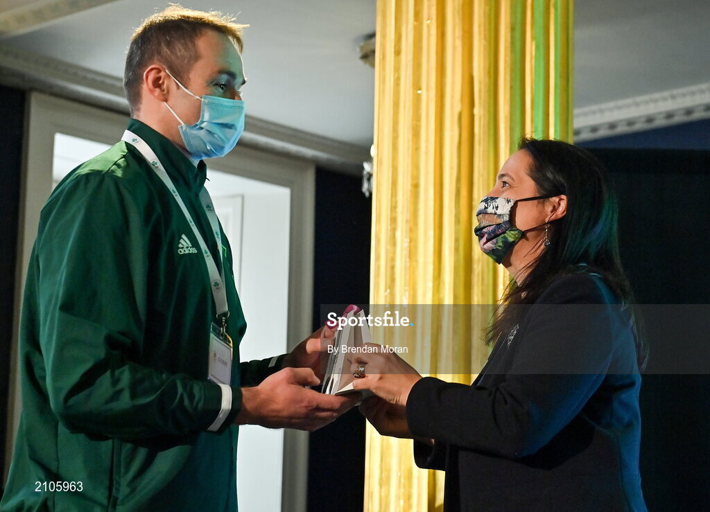 29 October 2021; The athletes and staff who represented Team Ireland at Tokyo 2020 this summer were formally congratulated at the Official Team Ireland Homecoming in Dublin Castle. A record number of Irish athletes competed at the Summer Olympics in Japan with 116 athletes competing across nineteen sports. An Taoiseach Michéal Martin TD, Minister Catherine Martin TD, Minister of State Jack Chambers TD and His Excellency Ambassador Extraordinary and Plenipotentiary of Japan to Ireland, Mr Mitsuru Kitano attended the event to honour the athletes. Making a presentation to Team Ireland support staff member Jim O'Donovan is Minister for Media, Tourism, Arts, Culture, Sport and the Gaeltacht, Catherine Martin T.D. Photo by Brendan Moran/Sportsfile