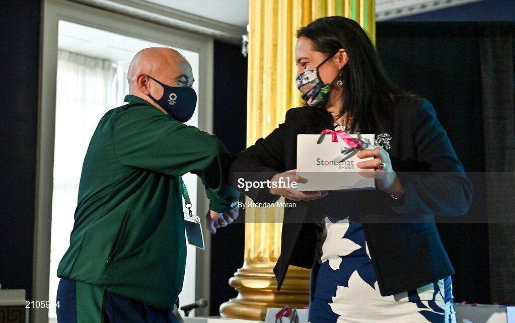 29 October 2021; The athletes and staff who represented Team Ireland at Tokyo 2020 this summer were formally congratulated at the Official Team Ireland Homecoming in Dublin Castle. A record number of Irish athletes competed at the Summer Olympics in Japan with 116 athletes competing across nineteen sports. An Taoiseach Michéal Martin TD, Minister Catherine Martin TD, Minister of State Jack Chambers TD and His Excellency Ambassador Extraordinary and Plenipotentiary of Japan to Ireland, Mr Mitsuru Kitano attended the event to honour the athletes. Making a presentation to Team Ireland support staff member Ciaran Ward is Minister for Media, Tourism, Arts, Culture, Sport and the Gaeltacht, Catherine Martin T.D. Photo by Brendan Moran/Sportsfile