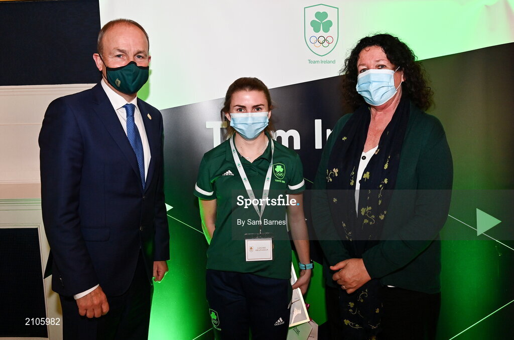 29 October 2021; The athletes and staff who represented Team Ireland at Tokyo 2020 this summer were formally congratulated at the Official Team Ireland Homecoming in Dublin Castle. A record number of Irish athletes competed at the Summer Olympics in Japan with 116 athletes competing across nineteen sports. An Taoiseach Michéal Martin TD, Minister Catherine Martin TD, Minister of State Jack Chambers TD and His Excellency Ambassador Extraordinary and Plenipotentiary of Japan to Ireland, Mr Mitsuru Kitano attended the event to honour the athletes. Pictured is An Taoiseach Micheál Martin TD with Team Ireland Tokyo 2020 Chef de Mission Patricia Heberle and Team Ireland Olympian Louise Shanahan. Photo by Sam Barnes/Sportsfile