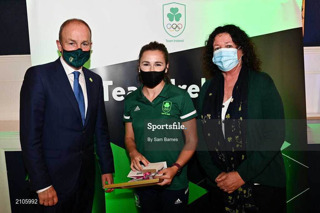 29 October 2021; The athletes and staff who represented Team Ireland at Tokyo 2020 this summer were formally congratulated at the Official Team Ireland Homecoming in Dublin Castle. A record number of Irish athletes competed at the Summer Olympics in Japan with 116 athletes competing across nineteen sports. An Taoiseach Michéal Martin TD, Minister Catherine Martin TD, Minister of State Jack Chambers TD and His Excellency Ambassador Extraordinary and Plenipotentiary of Japan to Ireland, Mr Mitsuru Kitano attended the event to honour the athletes. Pictured is An Taoiseach Micheál Martin TD with Team Ireland Tokyo 2020 Chef de Mission Patricia Heberle and Team Ireland Olympian Phil Healy. Photo by Sam Barnes/Sportsfile