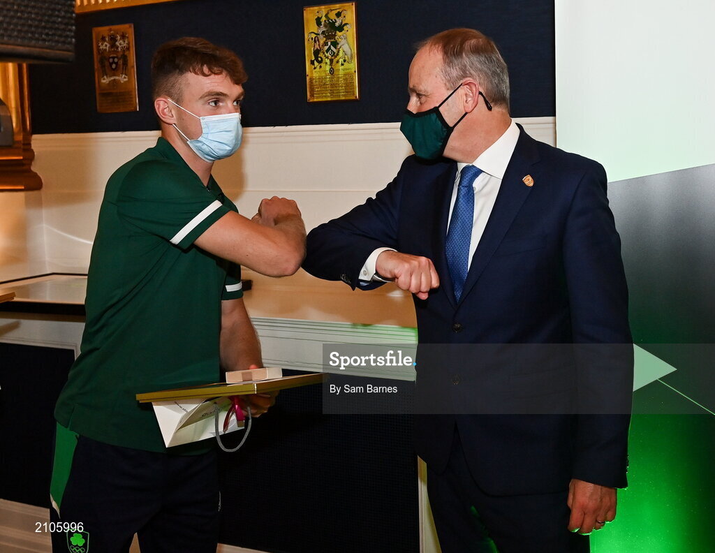29 October 2021; The athletes and staff who represented Team Ireland at Tokyo 2020 this summer were formally congratulated at the Official Team Ireland Homecoming in Dublin Castle. A record number of Irish athletes competed at the Summer Olympics in Japan with 116 athletes competing across nineteen sports. An Taoiseach Michéal Martin TD, Minister Catherine Martin TD, Minister of State Jack Chambers TD and His Excellency Ambassador Extraordinary and Plenipotentiary of Japan to Ireland, Mr Mitsuru Kitano attended the event to honour the athletes. Pictured is An Taoiseach Micheál Martin TD with Team Ireland Olympian Marcus Lawler. Photo by Sam Barnes/Sportsfile