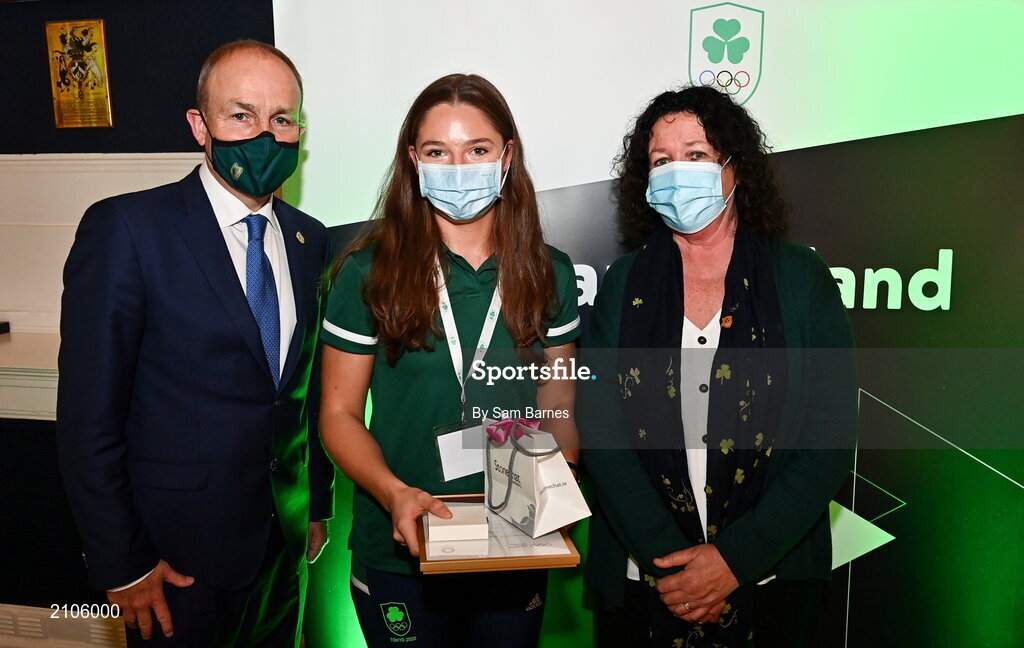 29 October 2021; The athletes and staff who represented Team Ireland at Tokyo 2020 this summer were formally congratulated at the Official Team Ireland Homecoming in Dublin Castle. A record number of Irish athletes competed at the Summer Olympics in Japan with 116 athletes competing across nineteen sports. An Taoiseach Michéal Martin TD, Minister Catherine Martin TD, Minister of State Jack Chambers TD and His Excellency Ambassador Extraordinary and Plenipotentiary of Japan to Ireland, Mr Mitsuru Kitano attended the event to honour the athletes. Pictured is An Taoiseach Micheál Martin TD with Team Ireland Tokyo 2020 Chef de Mission Patricia Heberle and Team Ireland Olympian Tara Hanlon. Photo by Sam Barnes/Sportsfile