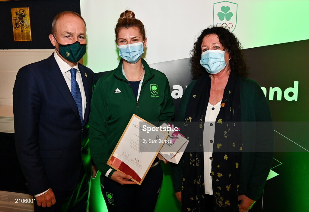 29 October 2021; The athletes and staff who represented Team Ireland at Tokyo 2020 this summer were formally congratulated at the Official Team Ireland Homecoming in Dublin Castle. A record number of Irish athletes competed at the Summer Olympics in Japan with 116 athletes competing across nineteen sports. An Taoiseach Michéal Martin TD, Minister Catherine Martin TD, Minister of State Jack Chambers TD and His Excellency Ambassador Extraordinary and Plenipotentiary of Japan to Ireland, Mr Mitsuru Kitano attended the event to honour the athletes. Pictured is An Taoiseach Micheál Martin TD with Team Ireland Tokyo 2020 Chef de Mission Patricia Heberle and Team Ireland Olympian Monika Dukarska. Photo by Sam Barnes/Sportsfile