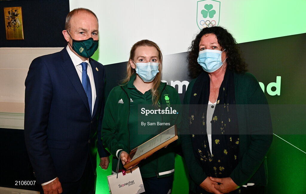 29 October 2021; The athletes and staff who represented Team Ireland at Tokyo 2020 this summer were formally congratulated at the Official Team Ireland Homecoming in Dublin Castle. A record number of Irish athletes competed at the Summer Olympics in Japan with 116 athletes competing across nineteen sports. An Taoiseach Michéal Martin TD, Minister Catherine Martin TD, Minister of State Jack Chambers TD and His Excellency Ambassador Extraordinary and Plenipotentiary of Japan to Ireland, Mr Mitsuru Kitano attended the event to honour the athletes. Pictured is An Taoiseach Micheál Martin TD with Team Ireland Tokyo 2020 Chef de Mission Patricia Heberle and Team Ireland Olympian Aoife Casey. Photo by Sam Barnes/Sportsfile