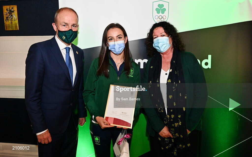 29 October 2021; The athletes and staff who represented Team Ireland at Tokyo 2020 this summer were formally congratulated at the Official Team Ireland Homecoming in Dublin Castle. A record number of Irish athletes competed at the Summer Olympics in Japan with 116 athletes competing across nineteen sports. An Taoiseach Michéal Martin TD, Minister Catherine Martin TD, Minister of State Jack Chambers TD and His Excellency Ambassador Extraordinary and Plenipotentiary of Japan to Ireland, Mr Mitsuru Kitano attended the event to honour the athletes. Pictured is An Taoiseach Micheál Martin TD with Team Ireland Tokyo 2020 Chef de Mission Patricia Heberle and Team Ireland Olympian Hannah McLoughlin. Photo by Sam Barnes/Sportsfile