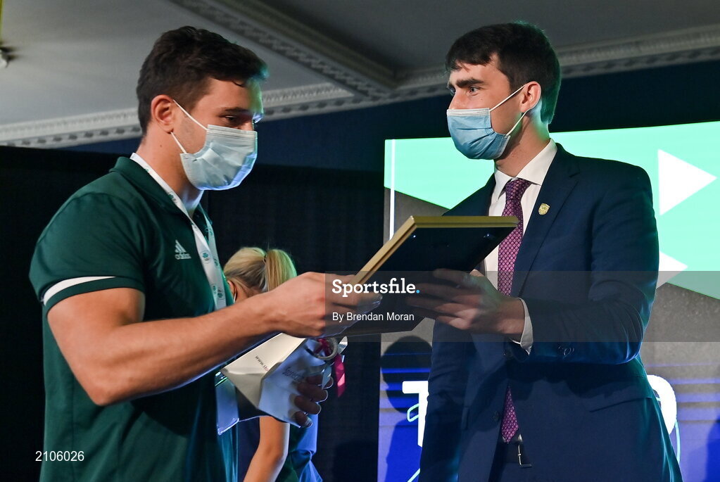 29 October 2021; The athletes and staff who represented Team Ireland at Tokyo 2020 this summer were formally congratulated at the Official Team Ireland Homecoming in Dublin Castle. A record number of Irish athletes competed at the Summer Olympics in Japan with 116 athletes competing across nineteen sports. An Taoiseach Michéal Martin TD, Minister Catherine Martin TD, Minister of State Jack Chambers TD and His Excellency Ambassador Extraordinary and Plenipotentiary of Japan to Ireland, Mr Mitsuru Kitano attended the event to honour the athletes. Making a presentation to Team Ireland athlete Foster Horan is Minister of State for Sport, the Gaeltacht & Defence, Jack Chambers TD. Photo by Brendan Moran/Sportsfile