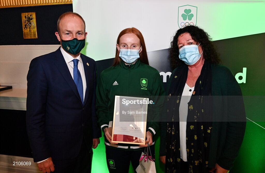 29 October 2021; The athletes and staff who represented Team Ireland at Tokyo 2020 this summer were formally congratulated at the Official Team Ireland Homecoming in Dublin Castle. A record number of Irish athletes competed at the Summer Olympics in Japan with 116 athletes competing across nineteen sports. An Taoiseach Michéal Martin TD, Minister Catherine Martin TD, Minister of State Jack Chambers TD and His Excellency Ambassador Extraordinary and Plenipotentiary of Japan to Ireland, Mr Mitsuru Kitano attended the event to honour the athletes. Pictured is An Taoiseach Micheál Martin TD with Team Ireland Tokyo 2020 Chef de Mission Patricia Heberle and Team Ireland Olympian Danielle Hill. Photo by Sam Barnes/Sportsfile