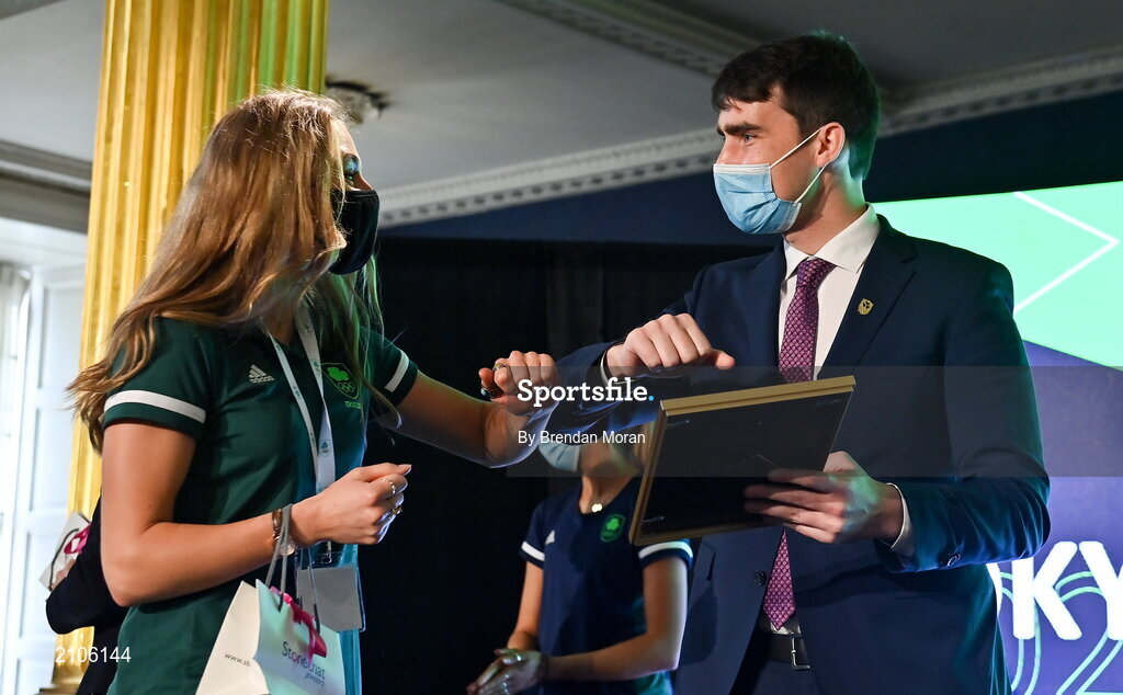 29 October 2021; The athletes and staff who represented Team Ireland at Tokyo 2020 this summer were formally congratulated at the Official Team Ireland Homecoming in Dublin Castle. A record number of Irish athletes competed at the Summer Olympics in Japan with 116 athletes competing across nineteen sports. An Taoiseach Michéal Martin TD, Minister Catherine Martin TD, Minister of State Jack Chambers TD and His Excellency Ambassador Extraordinary and Plenipotentiary of Japan to Ireland, Mr Mitsuru Kitano attended the event to honour the athletes. Making a presentation to Team Ireland athlete Sophie Becker is Minister of State for Sport, the Gaeltacht & Defence, Jack Chambers TD. Photo by Brendan Moran/Sportsfile