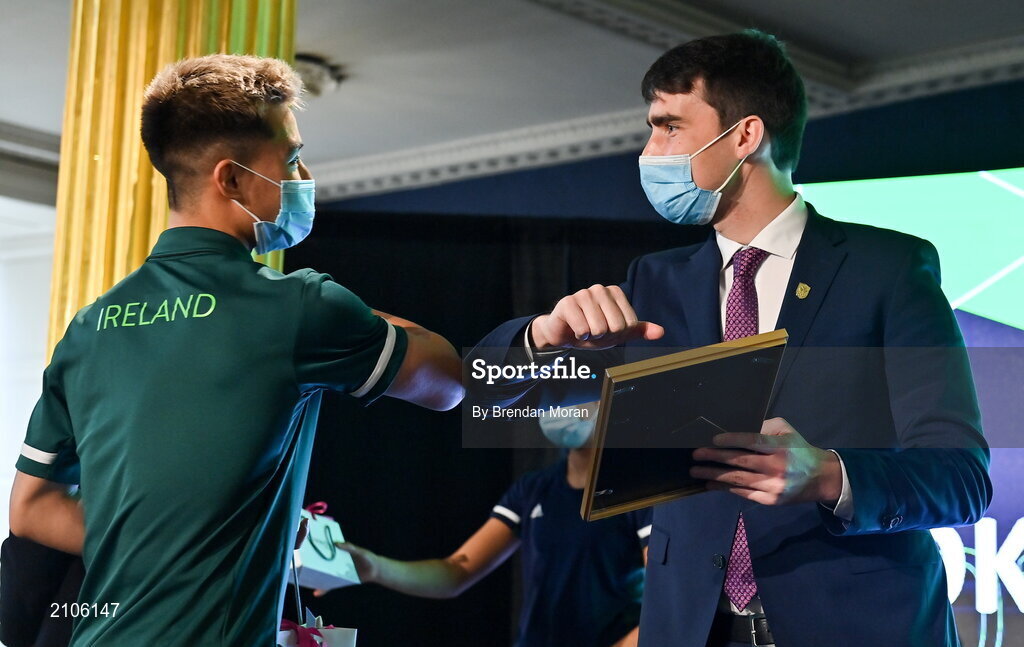 29 October 2021; The athletes and staff who represented Team Ireland at Tokyo 2020 this summer were formally congratulated at the Official Team Ireland Homecoming in Dublin Castle. A record number of Irish athletes competed at the Summer Olympics in Japan with 116 athletes competing across nineteen sports. An Taoiseach Michéal Martin TD, Minister Catherine Martin TD, Minister of State Jack Chambers TD and His Excellency Ambassador Extraordinary and Plenipotentiary of Japan to Ireland, Mr Mitsuru Kitano attended the event to honour the athletes. Making a presentation to Team Ireland athlete Nhat Nguyen is Minister of State for Sport, the Gaeltacht & Defence, Jack Chambers TD. Photo by Brendan Moran/Sportsfile