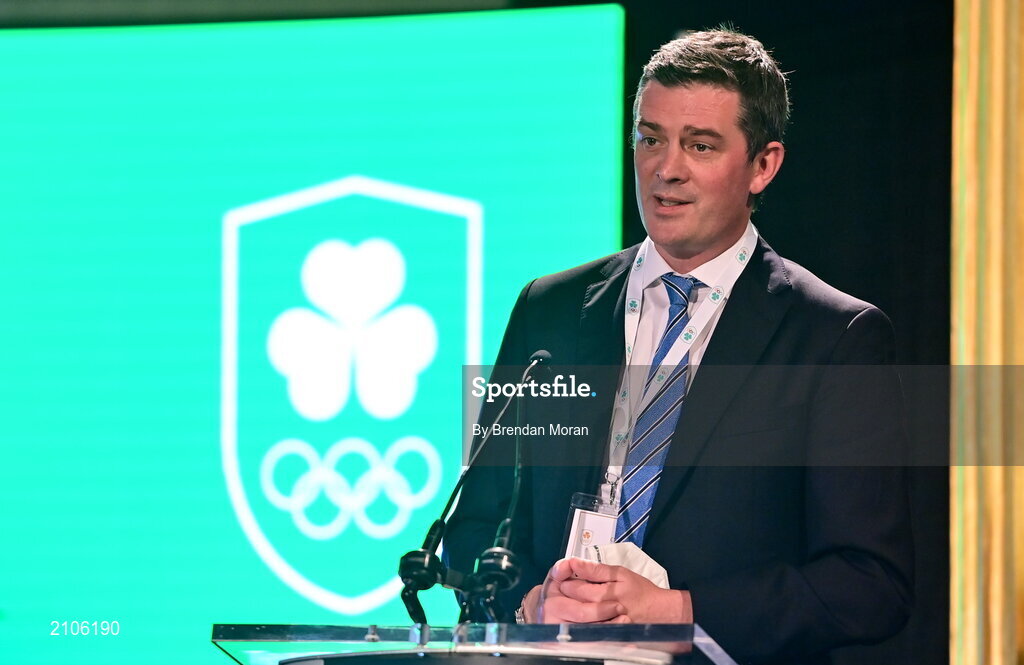 29 October 2021; The athletes and staff who represented Team Ireland at Tokyo 2020 this summer were formally congratulated at the Official Team Ireland Homecoming in Dublin Castle. A record number of Irish athletes competed at the Summer Olympics in Japan with 116 athletes competing across nineteen sports. An Taoiseach Michéal Martin TD, Minister Catherine Martin TD, Minister of State Jack Chambers TD and His Excellency Ambassador Extraordinary and Plenipotentiary of Japan to Ireland, Mr Mitsuru Kitano attended the event to honour the athletes. Speaking at the homecoming is OFI chief executive Peter Sherrard. Photo by Brendan Moran/Sportsfile