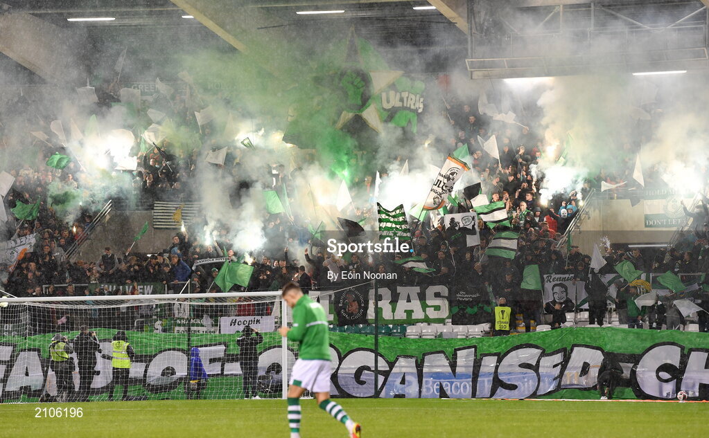 29 October 2021; Shamrock Rovers supporters cheer on their side before the SSE Airtricity League Premier Division match between Shamrock Rovers and Finn Harps at Tallaght Stadium in Dublin. Photo by Eóin Noonan/Sportsfile