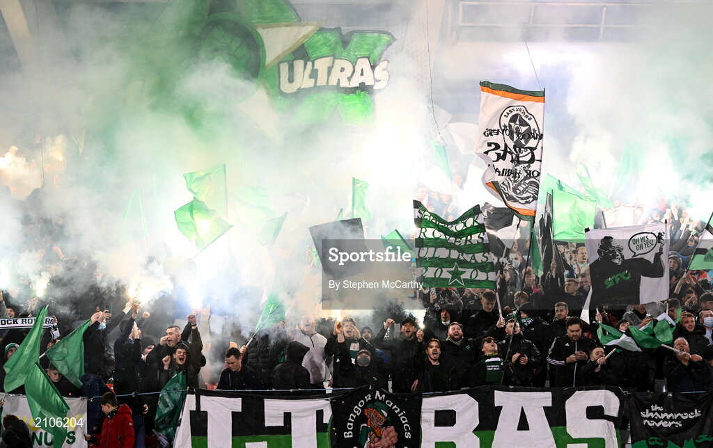 29 October 2021; Shamrock Rovers supporters cheer on their side before the SSE Airtricity League Premier Division match between Shamrock Rovers and Finn Harps at Tallaght Stadium in Dublin. Photo by Stephen McCarthy/Sportsfile