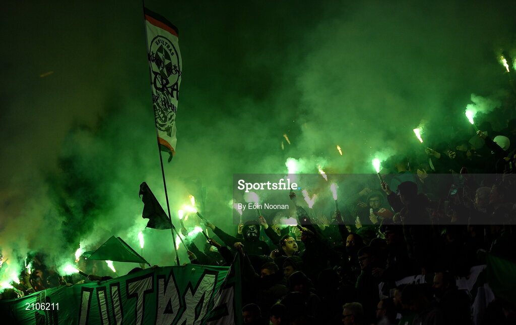 29 October 2021; Shamrock Rovers supporters cheer on their side before the SSE Airtricity League Premier Division match between Shamrock Rovers and Finn Harps at Tallaght Stadium in Dublin. Photo by Eóin Noonan/Sportsfile