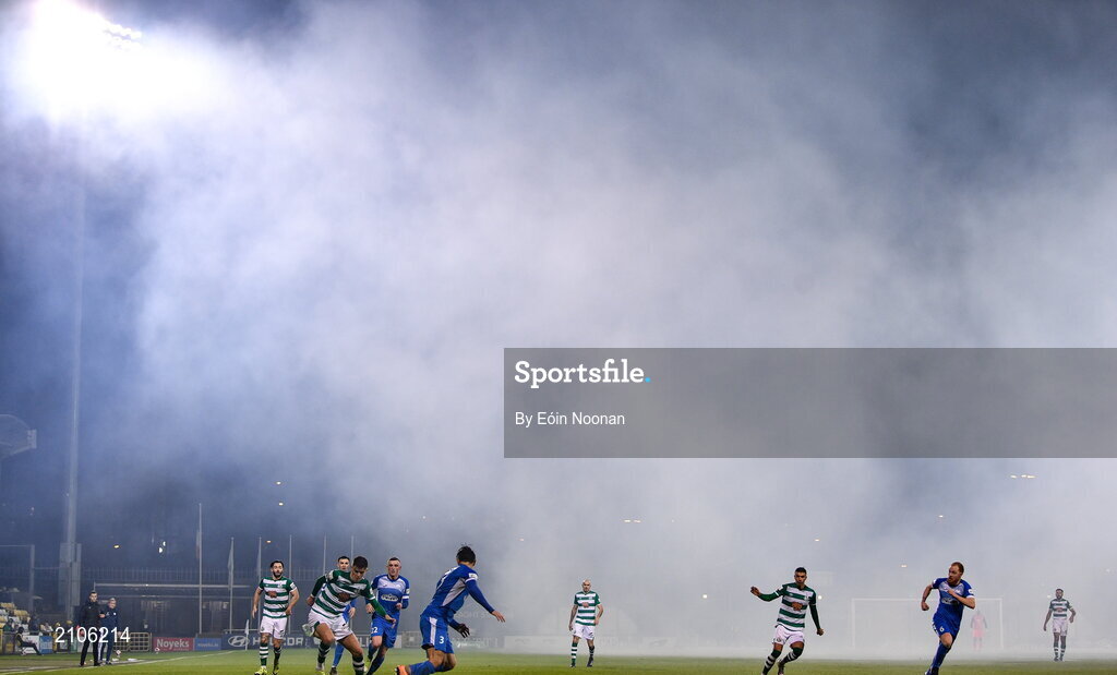29 October 2021; Sean Gannon of Shamrock Rovers in action against Jordan Mustoe of Finn Harps during the SSE Airtricity League Premier Division match between Shamrock Rovers and Finn Harps at Tallaght Stadium in Dublin. Photo by Eóin Noonan/Sportsfile