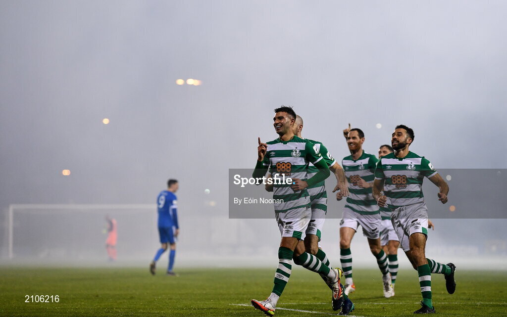 29 October 2021; Danny Mandroiu of Shamrock Rovers, left, celebrates after scoring his side's second goal during the SSE Airtricity League Premier Division match between Shamrock Rovers and Finn Harps at Tallaght Stadium in Dublin. Photo by Eóin Noonan/Sportsfile