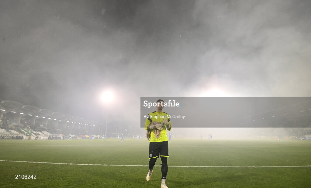 29 October 2021; Finn Harps goalkeeper Mark Anthony McGinley gets into position as smoke from flares envelopes the pitch before the SSE Airtricity League Premier Division match between Shamrock Rovers and Finn Harps at Tallaght Stadium in Dublin. Photo by Stephen McCarthy/Sportsfile