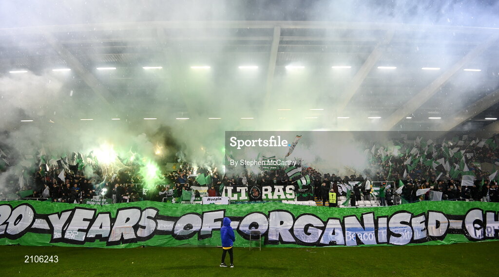 29 October 2021; A ballboy looks on as Shamrock Rovers supporters cheer on their side before the SSE Airtricity League Premier Division match between Shamrock Rovers and Finn Harps at Tallaght Stadium in Dublin. Photo by Stephen McCarthy/Sportsfile