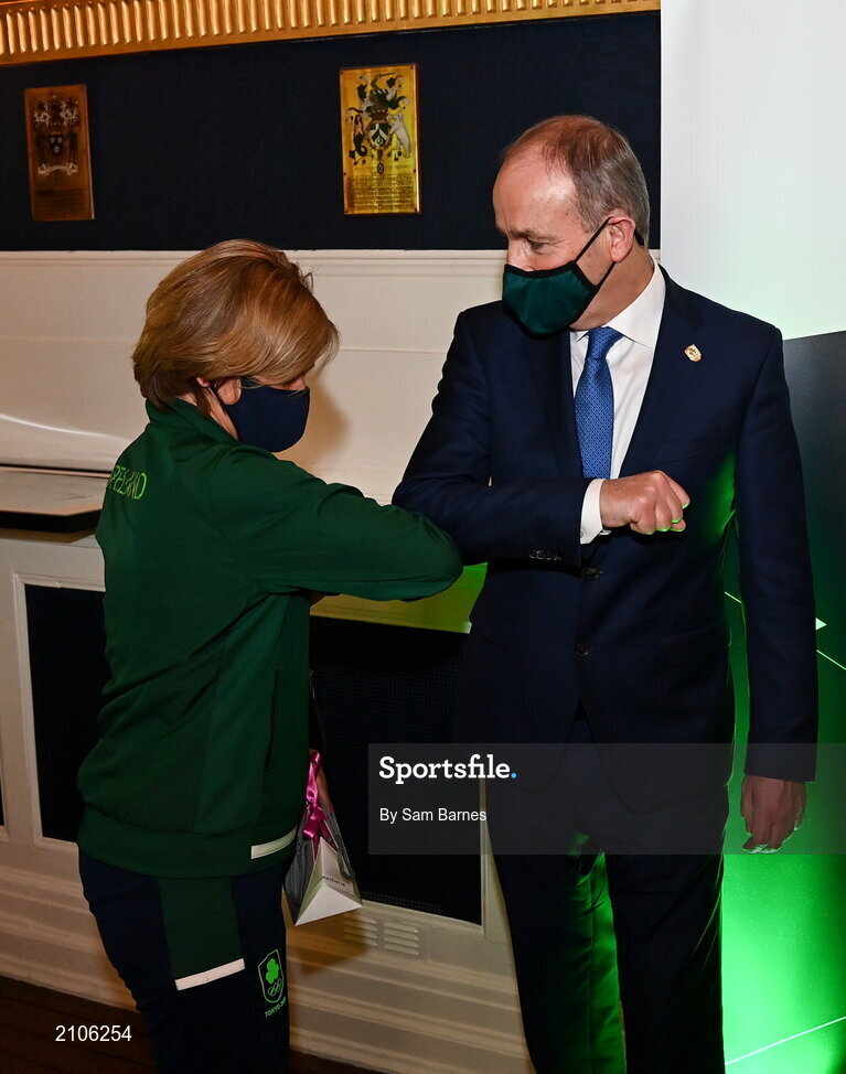 29 October 2021; The athletes and staff who represented Team Ireland at Tokyo 2020 this summer were formally congratulated at the Official Team Ireland Homecoming in Dublin Castle. A record number of Irish athletes competed at the Summer Olympics in Japan with 116 athletes competing across nineteen sports. An Taoiseach Michéal Martin TD, Minister Catherine Martin TD, Minister of State Jack Chambers TD and His Excellency Ambassador Extraordinary and Plenipotentiary of Japan to Ireland, Mr Mitsuru Kitano attended the event to honour the athletes. Pictured is An Taoiseach Micheál Martin TD with Team Ireland support staff member Noelle Morrissey. Photo by Sam Barnes/Sportsfile